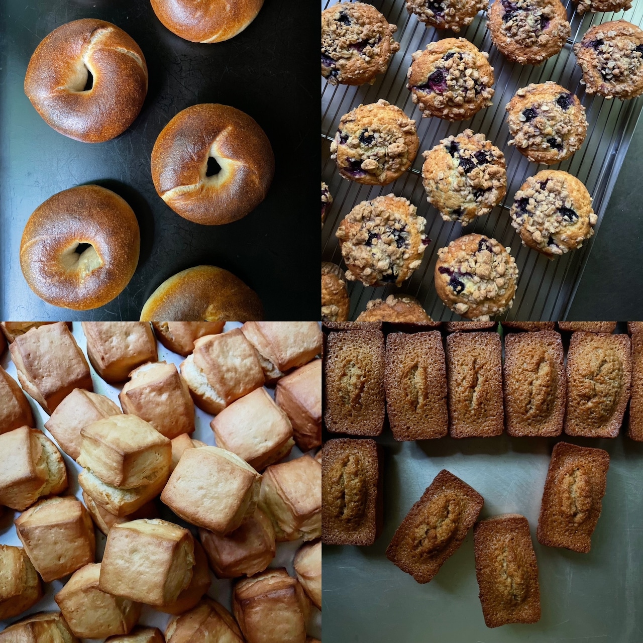 有機小麦粉(北海道産)、有機全粒粉(北海道産)、ベーキングパウダー(アルミニウムフリー)、バター(北海道産)、素焚糖(奄美大島産)、有機粉糖(ブラジル産)、平飼い卵(長野県産)、カンホアの塩(ベトナム産)、牛乳(埼玉県産)、有機オートミール(アメリカ産)、ブルーベリー(根羽村産自然栽培)